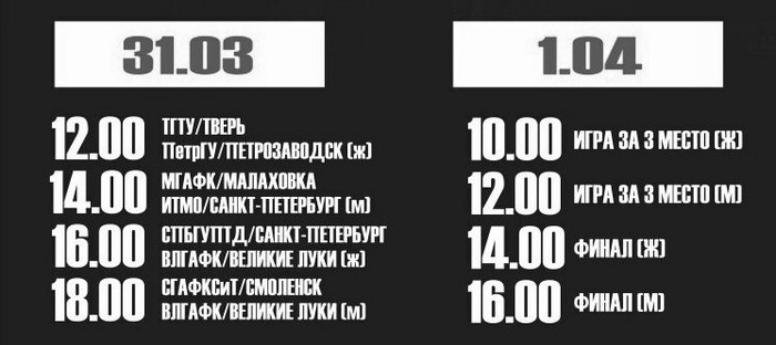 В играх примут участие команды из города Петрозаводска (женская команда ПетрГУ), Санкт-Петербурга (мужская команда ИТМО и женская команда СПБГУПТД), Смоленска (мужская команда СГАФКСиТ), Малаховки (команда МГАФК), Твери (женская команда ТГТУ).
