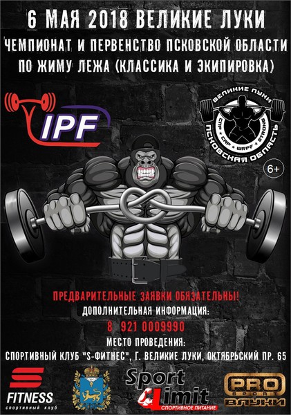 6 мая 2018 года, при поддержке Администрации Псковской области, в Великих Луках пройдет Чемпионат и Первенство Псковской области по жиму штанги лежа в классическом и экипировочном дивизионах (IPF).