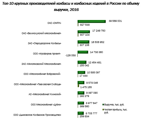 Что касается крупнейших игроков рынка, в рейтинге по объему полученной выручки за 2016 год лидером стало ОАО «Останкинский мясоперерабатывающий комбинат», выпускающее колбасы, сосиски, сардельки, в том числе под брендом «Папа может!». Компания получила выручку в размере 39,6 млрд. руб., +7,6% за год.