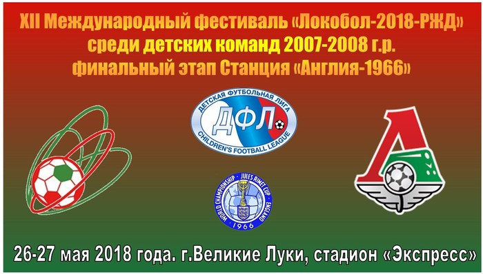 С 26 по 27 мая 2018 года в городе Великие Луки на стадионе «Экспресс» пройдёт второй финальный этап Международного фестиваля «Локобол-2018-РЖД» среди детских футбольных команд мальчиков 2007-2008 годов рождения станция «Англия-1966».