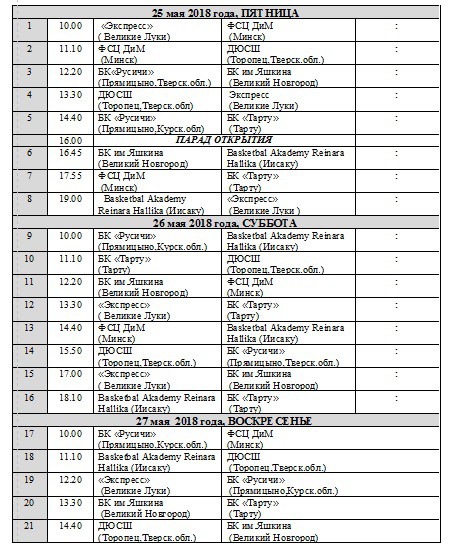 В турнире примут участие команды из России, Беларуссии и Эстонии: Прямицыно (Курская область, БК»Русичи»); Великий Новгород (БК им.Яшкина); Минск (ФСЦ Ди М); Тарту (БК «Тарту»); Иисаку (Баскетбольная Академия Reinara Hallika); Торопец (ДЮСШ); Великие Луки (СШ «Экспресс»).