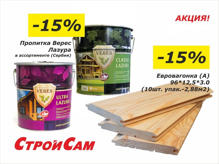 Весь август отдел «Строительный» предоставляет своим покупателям скидку 15% на пропитку VERES LAZURA и евровагонку сорт А 96*12,5*3.0 (10 шт. в упак.-2,88 м2 в упак.).