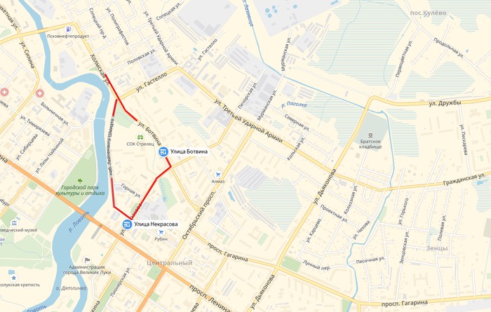 Объезд будет осуществляться по улицам: пр. Ленина, пр.Октябрьский, ул. 3-й Ударной Армии, ул. Гастелло, ул. Полиграфистов, ул. Половская, ул. Холмская, ул. Винатовского.