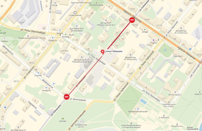 C 24 cентября по 31 декабря в связи с производством ремонтных работ будет закрыто движение автомобильного транспорта на участке дороги по ул. Сибирцева от пересечения с ул. Р. Люксембург до пересечения с ул. Виноградова и по ул. Сибирцева от пересечения с ул. Р. Люксембург до пересечения с пр. Ленина.