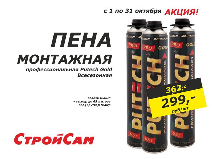 Магазин «СтройСам» предлагает скидку на профессиональную всесезонную монтажную пену Putech Gold, ее цена составит всего 299 рублей за штуку!