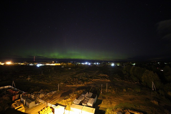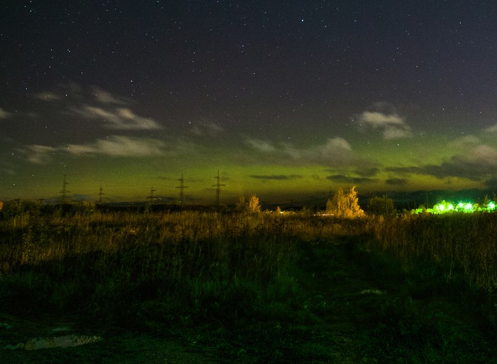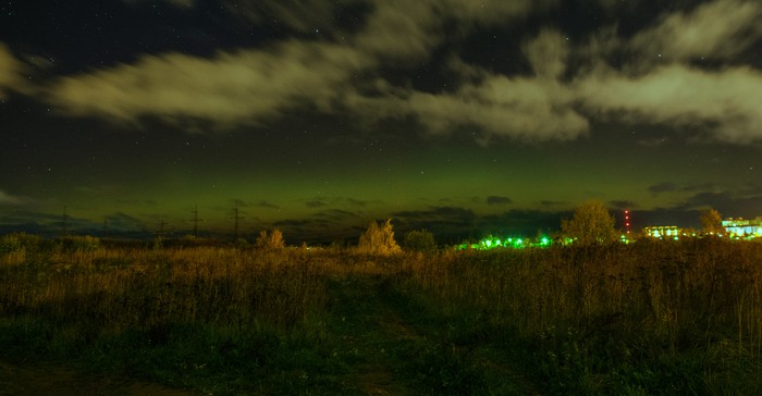 В целом же сияние после начала прояснений ярким не было. С полуночи до двух часов ночи ярких всплохов и столбов видно не было, на фотографии они тоже не проявлялись, лишь только слабое свечение было заметно в северной стороне низко над горизонтом, к тому же периодически мешали облака.