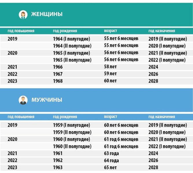 Повышение пенсионного возраста на первом этапе затронет мужчин 1959 г.р. и женщин 1964 г.р. Однако для этих граждан предусмотрен выход на пенсию на 6 месяцев раньше нового пенсионного возраста.