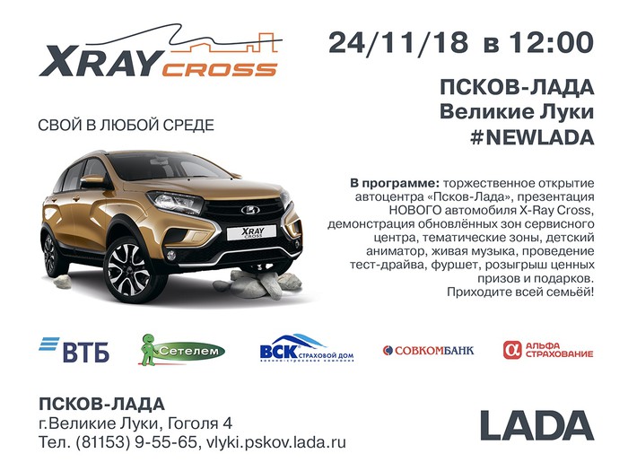 В стенах обновлённого салона можно будет познакомиться с автомобилем своей мечты — официальный дилер LADA в городе Великие Луки представит автомобиль способный открыть новые дороги и направления – LADA XRAY CROSS!