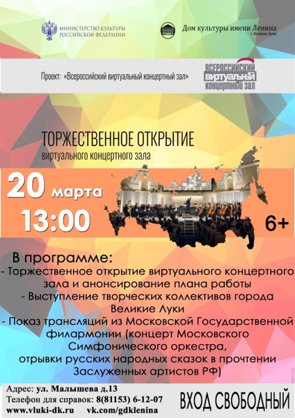 В программе торжественного открытия виртуального концертного зала - выступление лучших творческих коллективов города Великие Луки. Гостей также ждет показ трансляции из Московской Государственной филармонии (концерт Московсокго симфонического оркестра, отрывки русских народных сказок в прочтении Заслуженных артистов РФ).