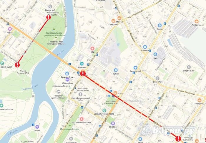 По пр. Ленина (от пл. Калинина до ул. Некрасова);