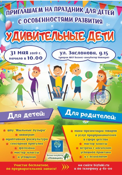31 мая в 10.00 в МАУ «Бизнес-инкубатор «Новация» состоится праздник «Удивительные дети» для детей с особенностями развития (0+).