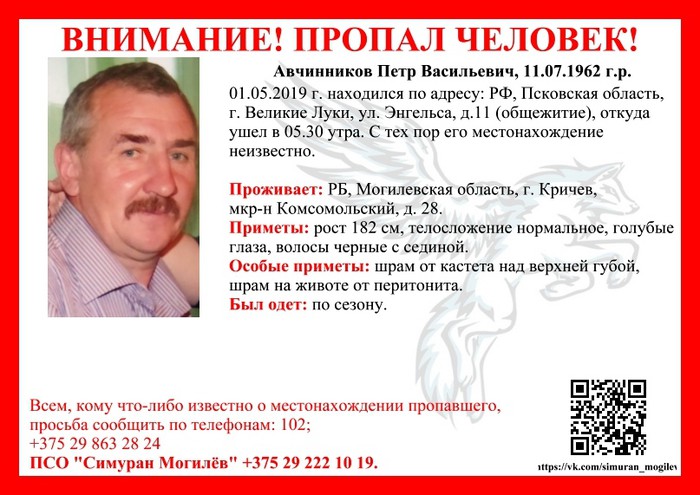 В Великих Луках пропал житель г. Кричев, Могилёвской области Авчинников Пётр Васильевич.
