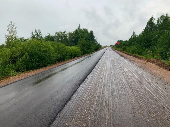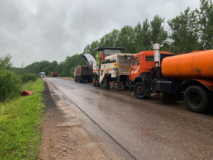 В настоящее время специалисты подрядной организации ведут фрезерование дорожного покрытия, устройство выравнивающего слоя. На этом участке автодороги предусмотрено устройство верхних слоев покрытия, восстановление обочин, нанесение дорожной разметки термопластиком.