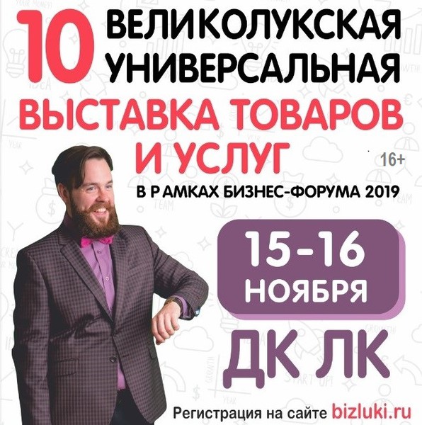 Уважаемые предприниматели, приглашаем Вас принять участие в 10-й Великолукской универсальной выставке-продаже товаров и услуг (16+), которая будет проходить в рамках Бизнес-форума с 15 по 16 ноября 2019 г. в городе Великие Луки Псковской области в ДК ЛК (ул. Зверева, 29).
