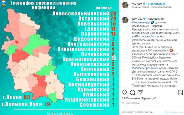 Губернатор Псковской области Михаил Ведерников в своём инстаграм-аккаунте сообщил, что 2 мая не пропустили в регион 754 автомобиля гостей, которые ехали в Псковскую область.