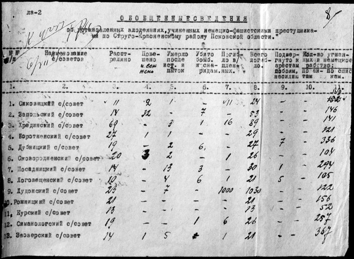 «Расстреляны. Сожжены. Повешены. Умерли после истязаний и пыток. Убито бомбами и снарядами. Погибло военнопленных. Угнано в немецкое рабство. Все это перечень в официальном документе обобщенных сведений о злодеяниях немецко-фашистских войск на территории Струго-Красненского района Псковской области в период оккупации. Датированы материалы 6 июля 1945 года. Сегодня этот документ хранится в Государственном архиве Российской Федерации.