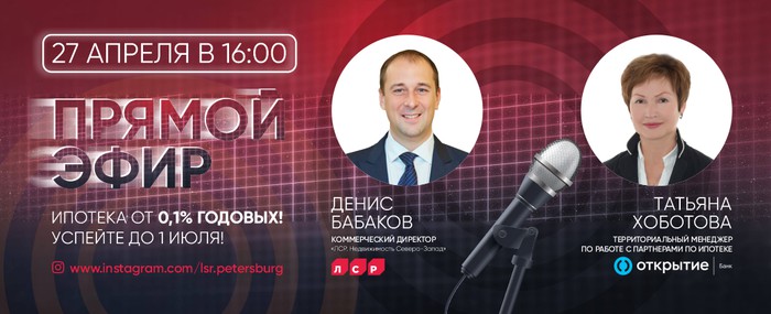 Как разобраться в банковских программах на покупку недвижимости и выбрать наиболее выгодный вариант – этой теме будет посвящена очередная онлайн-встреча в популярном Instagram-канале @sr.petersburg. В прямом эфире выступят Денис Бабаков, коммерческий директор «ЛСР. Недвижимость Северо-Запад», и Татьяна Хоботова, территориальный менеджер по работе с партнерами по ипотеке банка «Открытие».