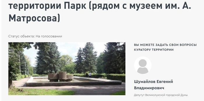 «На сайте проекта «Формирование комфортной городской среды», направленного на благоустройство общественных территорий, идёт голосование по благоустройству территорий в городах нашей области. В Великих Луках можно проголосовать за Благоустройство общественной территории Парк (рядом с музеем им. А. Матросова), но в описании говорится, что Александр Матвеевич Матросов был мальчиком 12-ти лет, хотя, насколько помню, на момент гибели ему было 19 лет. Прошу разобраться с ситуацией и отправить депутатов на курс истории родного края», - написал он.