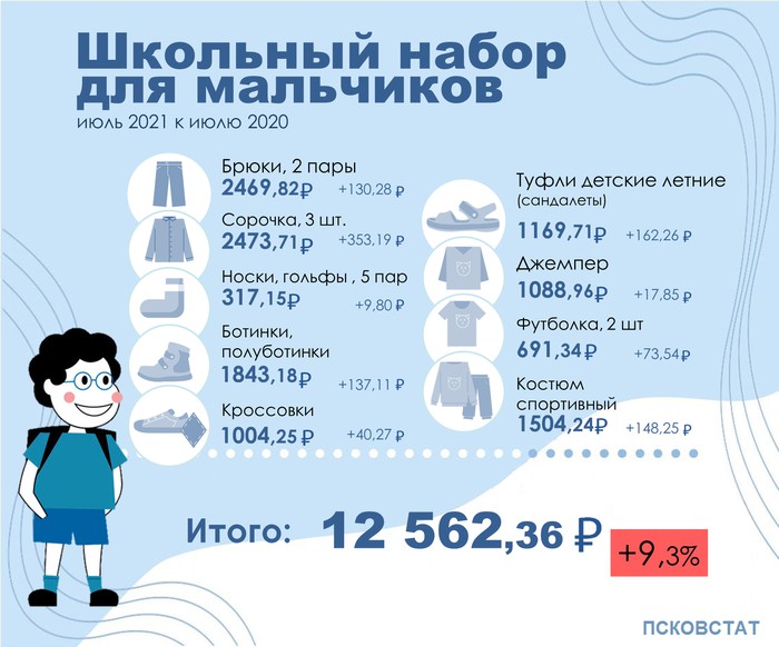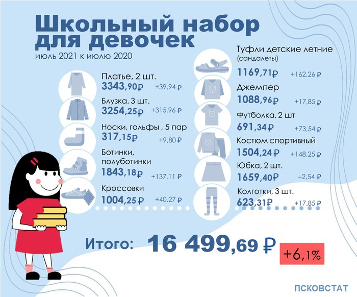 Стоимость школьного набора для мальчиков в 2021 году в Псковской области составила 17428,46 руб. и по сравнению с прошлым годом увеличилась на 4,5%, для девочек – 21365,79 руб. (увеличилась на 3,1%).