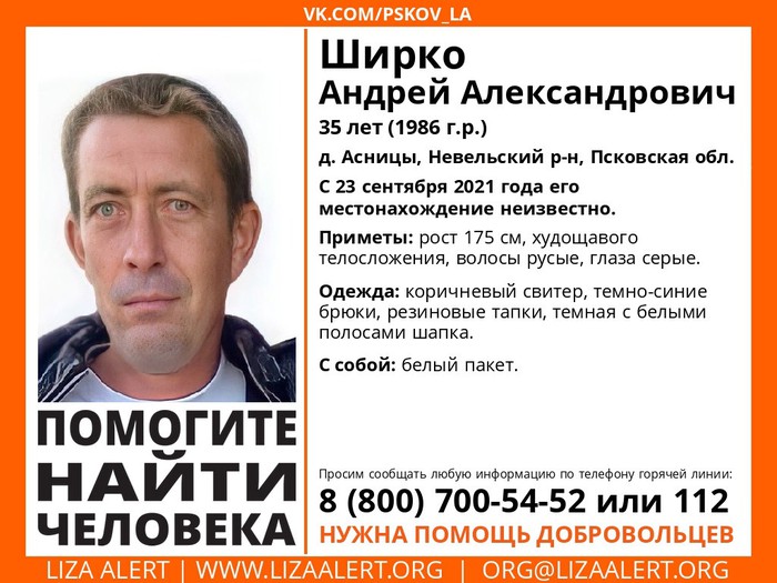 В деревне Асницы Невельского района пропал 35-летний Андрей Ширко, сообщает региональное отделение поискового отряда «ЛизаАлерт». С 23 сентября его местонахождение неизвестно.