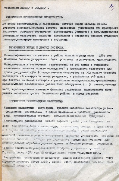 Среди документов, к примеру, можно отыскать многочисленные акты о злодеяниях фашистов. В их числе акт о зверствах в Усвятском районе. Здесь есть статистические данные: количество разрушенных жилых домов, школ, колхозных клубов, информация об утраченном производстве. Здесь же можно прочесть об уничтоженном поголовье скота: коровы, лошади, овцы, птица.