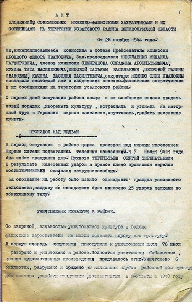 Наряду со статистикой описаны сцены наказания мирных граждан. 17 июля 1941 г. был избит житель деревни Пухново Терентьев Сергей Терентьевич. В результате ему сломали руку. За опоздание на работу были избиты 11 жителей Узковского сельсовета, каждому из опоздавших было нанесено 25 ударов палками по обнаженному телу. Акт был составлен с опорой на показания очевидцев в 1944 году», - написали архивисты.