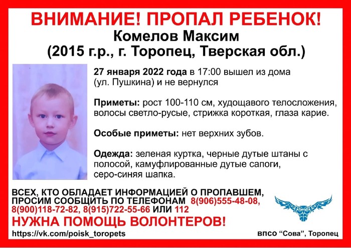 7-летний Максим Камелов пропал в Торопце 27 января. Около 17:00 мальчик ушёл из дома по адресу ул. Пушкина д.54 в магазин «Черёмушки» и до сих пор не вернулся, сообщается в группе в ВК «Подслушано Торопец».