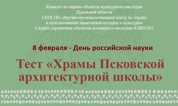 В День российской науки, который отмечается в нашей стране 8 февраля, жителей и гостей Псковской области приглашают принять участие в тестировании «Храмы Псковской архитектурной школы», посвященном серийному объекту всемирного наследия ЮНЕСКО.