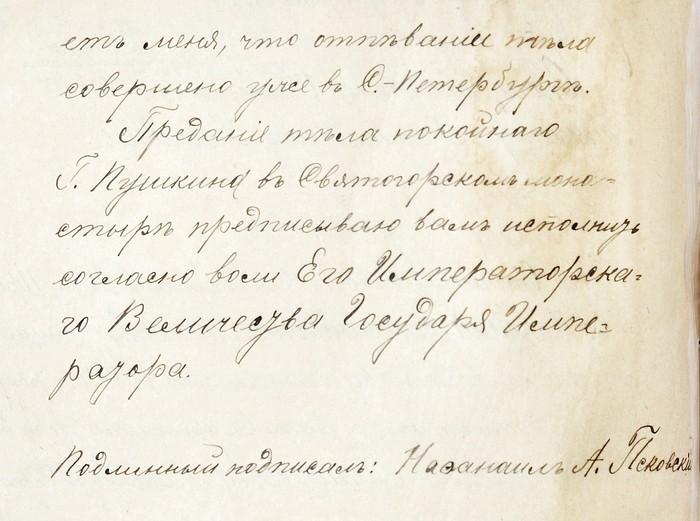 В фондах государственного архива Псковской области хранится уникальный документ – «Ордер о перевозе тела А. С. Пушкина в Псковскую губернию Опочецкого уезда в монастырь Святой Горы для предания тела земле, согласно желанию покойного».