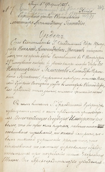 В фондах Государственного архива Псковской области хранится уникальный документ – «Ордер о перевозе тела А.С. Пушкина в Псковскую губернию Опочецкого уезда в монастырь Святой Горы для предания тела земле, согласно желанию покойного». Он датирован 5 февраля 1837 г. (ГАПО. Ф. 328. Оп. 1. Д. 237. Л. 267 – 267 об)."