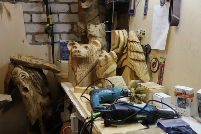 Свое хобби он нашел не так давно, около четырёх лет назад. Увидев работы других мастеров резьбы, тоже решил попробовать. Сейчас у Олега Иванова уже немало работ. Примечательно, что создает он их без эскизов: всё начинается с бензопилы, а для деталировки фигуры мастер использует бормашины или нож.