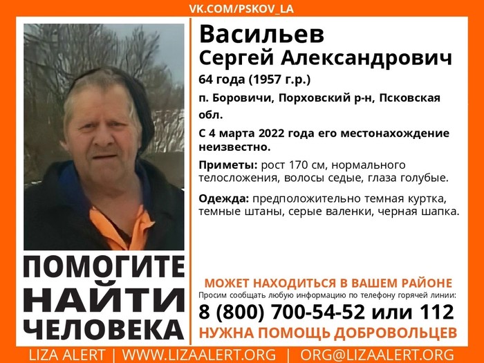 Пропал Васильев Сергей Александрович 64 лет, житель поселка Боровичи Порховского района Псковской области, об этом сообщается на странице ВК поискового отряда "ЛизаАлерт" Псковской области.