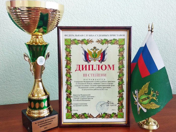 Руководитель УФССП по Псковской области Сергей Колесников получил диплом 3 степени и кубок «За лучшую организацию исполнительного производства» из рук директора Федеральной службы судебных приставов Дмитрия Аристова, сообщили интернет-порталу ВЛуки.ру в пресс-службе УФССП России по Псковской области.