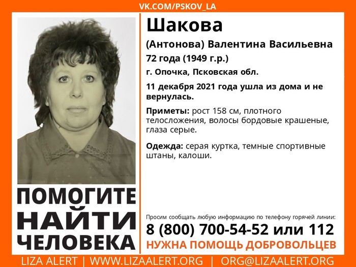 11 декабря 2021 года она вышла из дома и не вернулась. Приметы: рост 158 см, плотное телосложение, волосы бордовые (крашеные), глаза серые. Была одета в серую куртку, тёмные спортивные штаны, калоши.