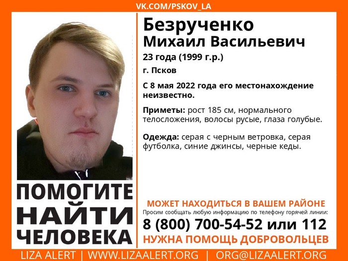 В г. Пскове пропал Безрученко Михаил Васильевич, 1999 г.р., об этом сообщается в группе ВКонтакте поискового отряда «ЛизаАлерт» Псковской области. Отмечается, что с 8 мая его местонахождение неизвестно.