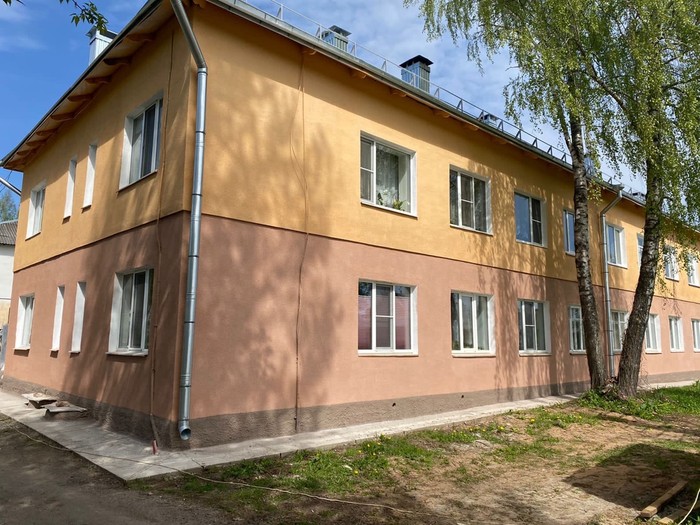 В рамках капитального ремонта фасада и фундамента подрядчик произвел очистку стен от старой штукатурки, выполнил окраску поверхности фасада, наружных откосов и цоколя. Произведена замена окон и дверей в местах общего пользования, выполнено устройство отмостки и козырьков над входами в подъезды.