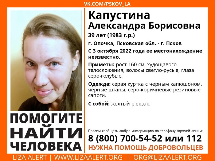 В Псковской области разыскивается Капустина Александра Борисовна, 1983 г.р. С 3 октября 2022 года ее местонахождение неизвестно. Об этом сообщается в группе поисково-спасательного отряда «ЛизаАлерт».