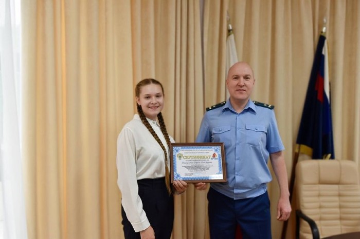 Исполняющий обязанности прокурора области Алексей Попов поздравил ученицу 8 «А» класса МБОУ «Средняя школа г. Новосокольники» Дарью Богданову с победой в творческом конкурсе «Твори закон на благо общества» и вручил сертификат на путевку в Артек.