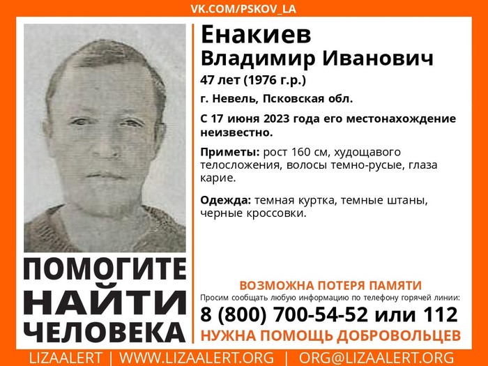 В Псковской области разыскивается Енакиев Владимир Иванович, 1976 г.р. С 17 июня его местонахождение неизвестно. Об этом сообщается в группе поисково-спасательного отряда «ЛизаАлерт».