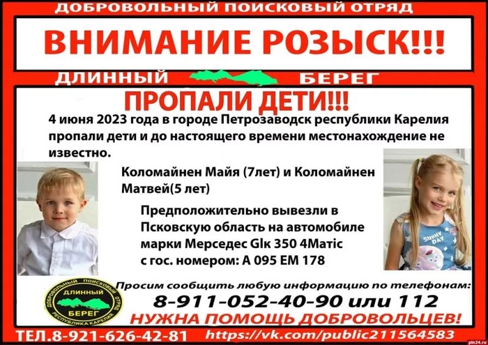 Похитители увезли 7-летнюю Майю и 5-летнего Матвея Коломайнен, предположительно, в Псковскую область. Об этом сообщается в группе добровольного поискового отряда «Длинный берег» Республики Карелия.