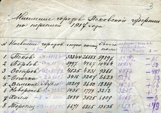 В Пскове по данным на 1917 год проживали 33 344 мужчины и 26 553 женщины, в Великих Луках – 10 219 мужчин и 8 650 женщин, в Порхове – 5 997 мужчин и 4 467 женщин.
