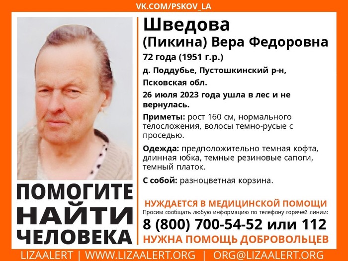 В Псковской области разыскивается Шведова Вера Фёдоровна, 1951 г.р. 26 июля она ушла в лес и не вернулась. Об этом сообщается в группе поисково-спасательного отряда «ЛизаАлерт».