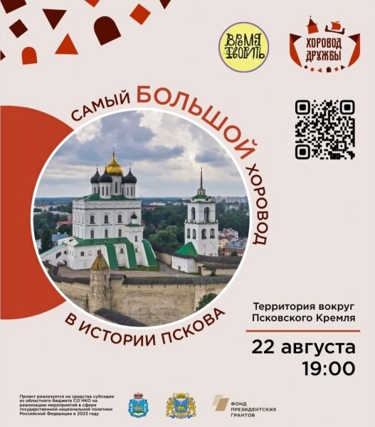 Самый масштабный в истории Псковской области хоровод пройдет вокруг территории древнего Кремля 22 августа в 19.00. Проект «Хоровод дружбы» реализуется АНО «Время творить» — победителем регионального конкурса субсидий для социально-ориентированных НКО и приурочен к празднованию Дня Государственного флага Российской Федерации.
