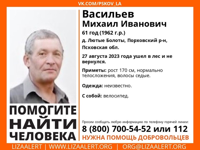 В Псковской области разыскивается Васильев Михаил Иванович, 1962 г.р. 27 августа он ушел в лес и не вернулся. Об этом сообщается в группе поисково-спасательного отряда «ЛизаАлерт».