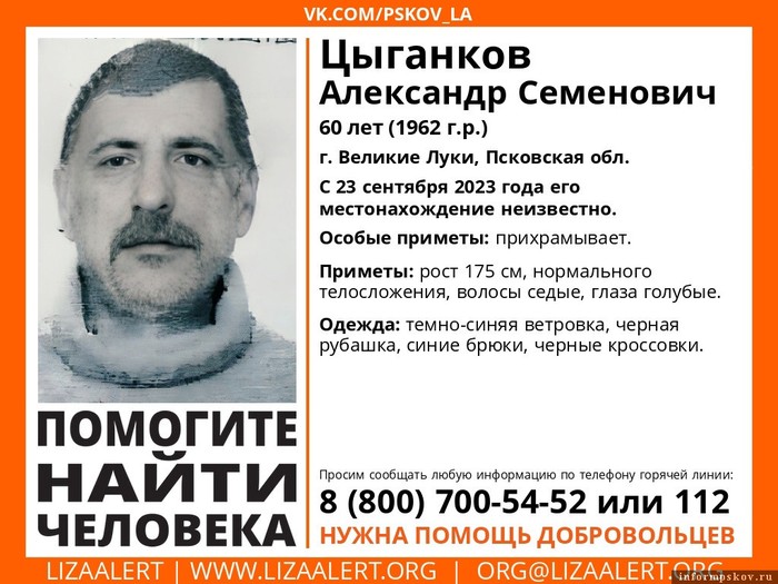 60-летний Александр Цыганков пропал в Великих Луках. С 23 сентября местонахождение мужчины неизвестно, сообщает ПАИ на группу поискового отряда «ЛизаАлерт» Псковской области.