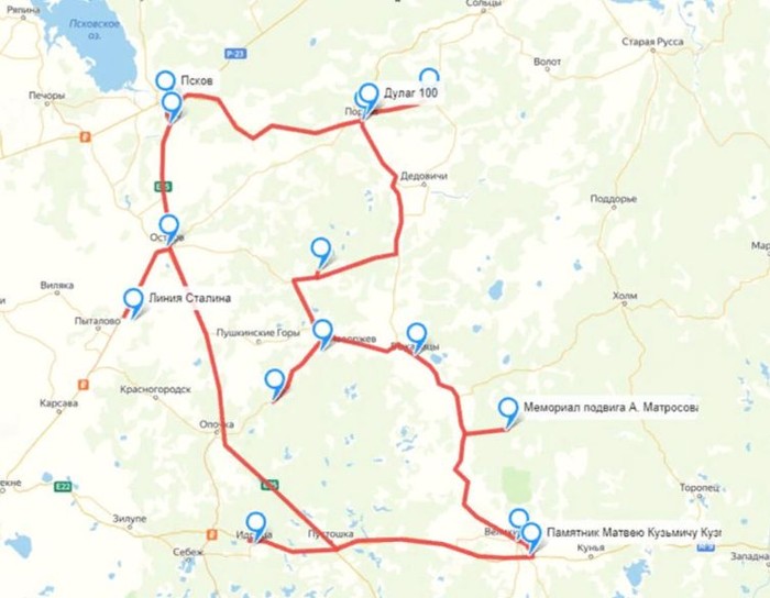 Отдельные точки маршрута связаны с именами Героев Великой Отечественной войны и целым дивизиям, участвовавшим в освобождении Псковской земли от фашистов, партизанам и подпольщикам, а также мирным жителям, внесшим неоценимый вклад в Победу.