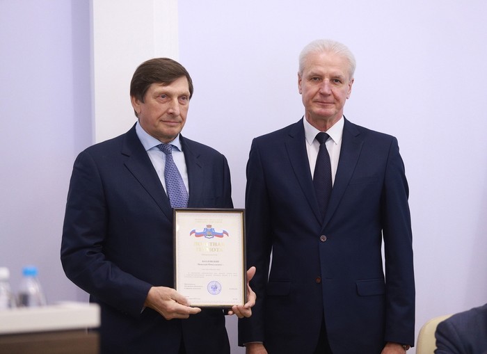 Награду за многолетний и добросовестный труд, большой личный в социально-экономическое развитие Псковской области вручил Николаю Николаевичу спикер регионального парламента Александр Котов в ходе очередной сессии областного Собрания.