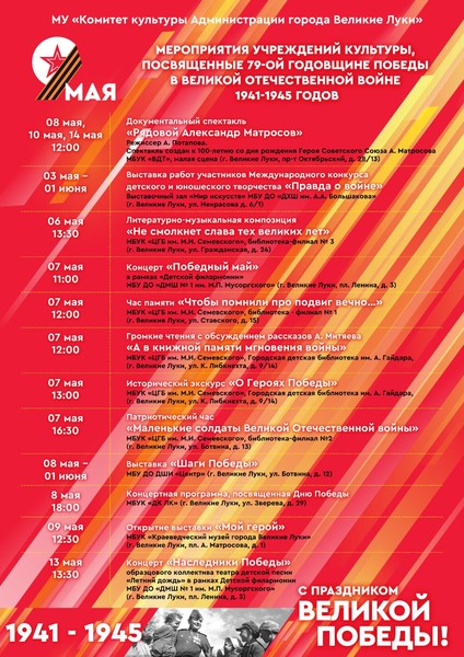 Администрация города Великие Луки опубликовала план мероприятий, посвященных 79-ой годовщине Победы в Великой Отечественной войне 1941-1945 годов: