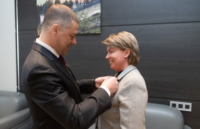 Губернатор Псковской области Михаил Ведерников по поручению Президента России вручил председателю регионального Комитета по здравоохранению Марине Гаращенко орден Пирогова.