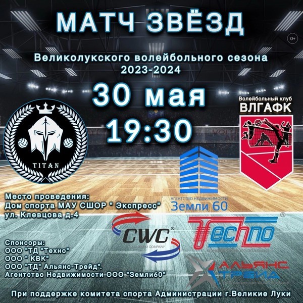 30 мая в 19:30 в Великих Луках в ВЛГАФК (Юбилейная площадь 4 к.2, здание бассейна) пройдёт «Матч звёзд» (0+) великолукского волейбольного сезона 2023-2024, сообщили интернет-порталу ВЛуки.ру участники турнира.